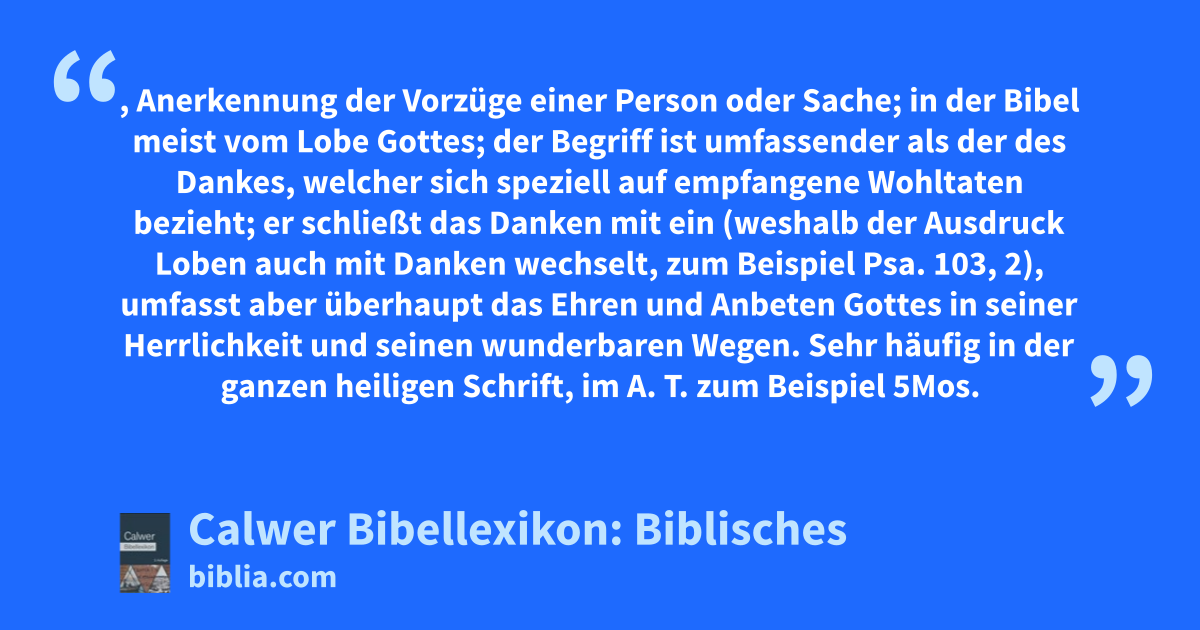 Sehr häufig in der ganzen heiligen Schrift, im A. T. zum Beispiel 5Mos. 8, 10; Richt. 5, 2; 1Kön. 8, 15. 1Kön. 8, 56; 1Kön. 10, 9; 1Chr. 29, 10. 1Chr. 29, 20; 2Chr. 20, 22; Esr. 3, 10. Esr. 3, 11; Neh. 5, 13; Neh. 8, 6; Neh. 9, 5; Hiob 1, 21, sehr oft in den Psalmen, sodann Jes. 25, 1; Jes. 38, 18. Jes. 38, 19; Jes. 49, 13; Jes. 60, 18; Jes. 64, 10; Dan. 4, 34; im N. T. Matth. 21, 9. Matth. 21, 16; Matth. 23, 39 (Lob Christi), ebenso Luk. 19, 38; Mark. 14, 26; Luk. 1, 68; Luk. 2, 13; Apg. 2, 47; Apg. 3, 8; Apg. 11, 18; Apg. 16, 25; Röm. 9, 5; Röm. 15, 9; Eph. 1, 3; Eph. 6, 12; Phil. 1, 11; 1Petr. 1, 3; Jak. 3, 9; Offb. 5, 12. Offb. 5, 13; Offb. 7, 12; Offb. 19, 1. Offb. 19, 3 (Hallelujah = lobet den Herrn). Lobsingen = singen zum Lob Gottes, besonders öffentliches, gemeinsames, feierliches Loben, zum Beispiel 2Mos. 15, 2; Psa. 18, 50; Psa. 30, 5; Psa. 47, 7. Psa. 47, 8; 59, 18; Psa. 66, 2; Psa. 68, 5; Psa. 75, 10; Psa. 92, 2; Psa. 106, 12; Psa. 108, 4; Psa. 138, 1; Jes. 12, 5; Jes. 24, 16; 1Chr. 23, 5 Lobsänger mit Saitenspielen, von der Tempelmusik. — Der Lobgesang (genannt „Hallel“) Matth. 26, 30 ist Psa. 115–118, denn beim Passahmahl pflegte man vor der Mahlzeit Psa. 113 und Psa. 114, und nach der Mahlzeit Psa. 115–118 zu singen.