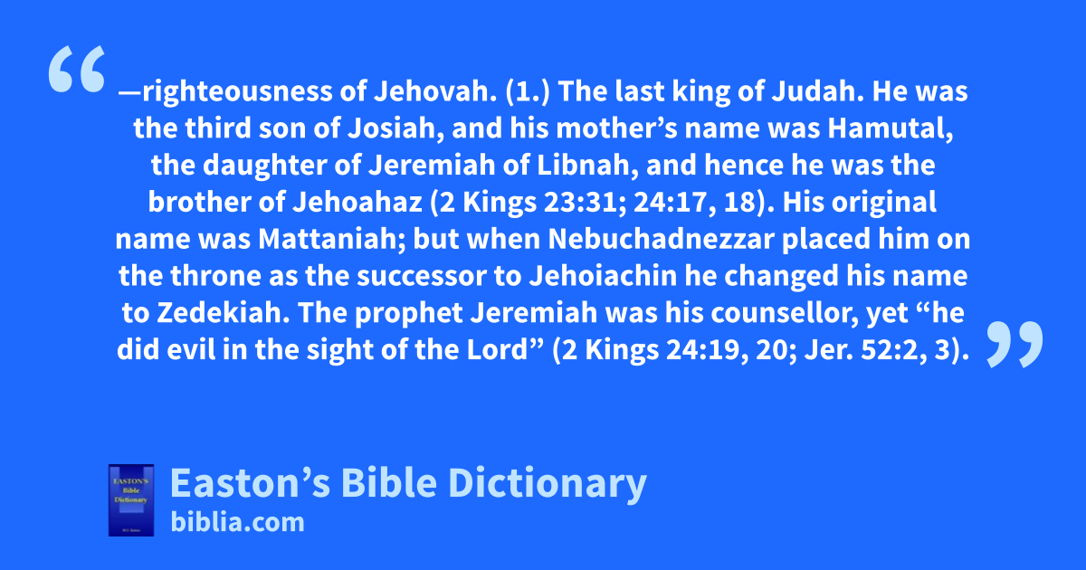 Zedekiah—righteousness of Jehovah. (1.) The last king of Judah. He was the third son of Josiah, and his mother’s name was Hamutal, the daughter of Jeremiah of Libnah, and hence he was the brother of Jehoahaz (2 Kings 23:31; 24:17, 18). His original name was Mattaniah; but when Nebuchadnezzar placed him on the throne as the successor to Jehoiachin he changed his name to Zedekiah. The prophet Jeremiah was his counsellor, yet “he did evil in the sight of the Lord” (2 Kings 24:19, 20; Jer. 52:2, 3). He ascended the throne at the age of twenty-one years. The kingdom was at that time tributary to Nebuchadnezzar; but, despite the strong remonstrances of Jeremiah and others, as well as the example of Jehoiachin, he threw off the yoke of Babylon, and entered into an alliance with Hophra, king of Egypt. This brought up Nebuchadnezzar, “with all his host” (2 King 25:1), against Jerusalem. During this siege, which lasted about eighteen months, “every worst woe befell the devoted city, which drank the cup of God’s fury to the dregs” (2 Kings 25:3; Lam. 4:4, 5, 10). The city was plundered and laid in ruins. Zedekiah and his followers, attempting to escape, were made captive and taken to Riblah. There, after seeing his own children put to death, his own eyes were put out, and, being loaded with chains, he was carried captive (b.c. 588) to Babylon (2 Kings 25:1–7; 2 Chr. 36:12; Jer. 32:4, 5; 34:2, 3; 39:1–7; 52:4–11; Ezek. 12:12), where he remained a prisoner, how long is unknown, to the day of his death.