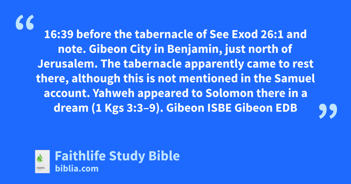 16:37–43 The Chronicler concludes the story of the ark’s placement in Jerusalem by listing the specific Levites who were charged with ministering before the ark. In addition to the Levites charged with ministering before the ark, the Chronicler lists priests whom David charged to minister at the tabernacle in Gibeon. |