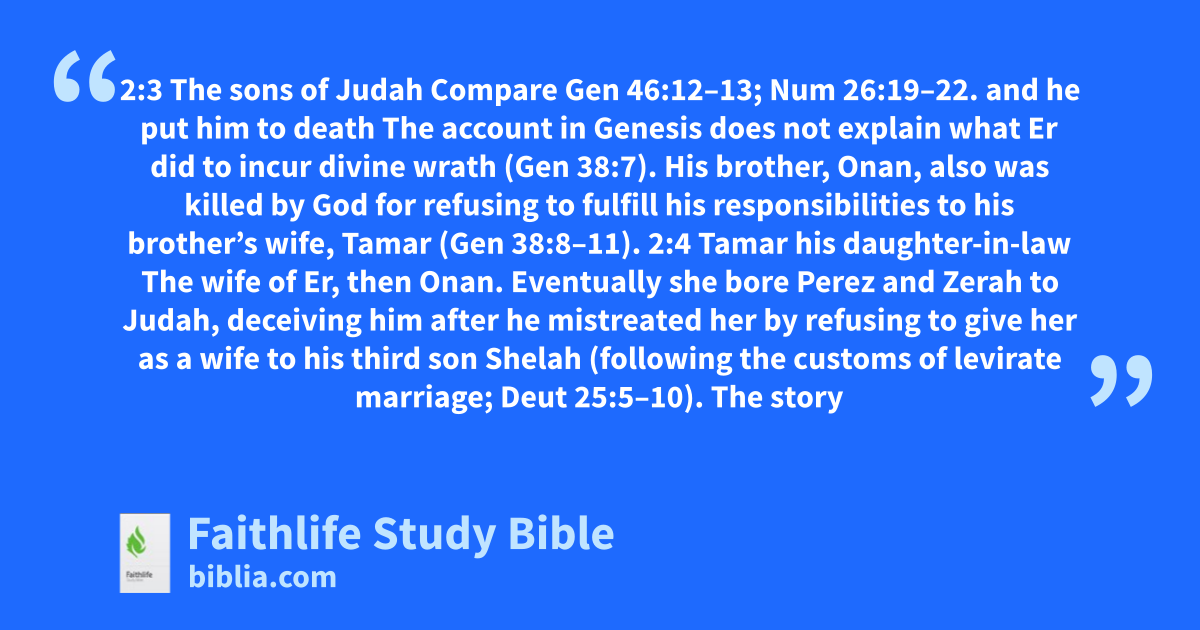 2:4 Tamar his daughter-in-law The wife of Er, then Onan. Eventually she bore Perez and Zerah to Judah, deceiving him after he mistreated her by refusing to give her as a wife to his third son Shelah (following the customs of levirate marriage; Deut 25:5–10). The story in Gen 38 centers around Tamar’s mistreatment in Judah’s household. See Gen 38:1–30 and note.