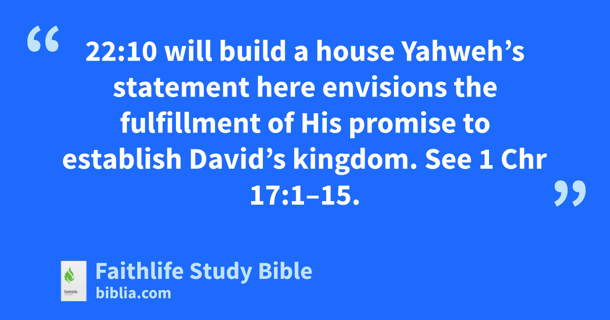 22:10 will build a house Yahweh’s statement here envisions the fulfillment of His promise to establish David’s kingdom. See 1 Chr 17:1–15.