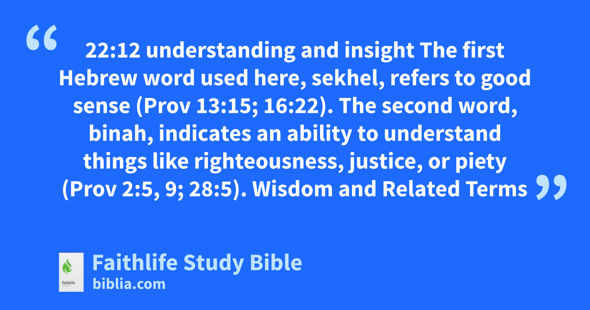 22:12 understanding and insight The first Hebrew word used here, sekhel, refers to good sense (Prov 13:15; 16:22). The second word, binah, indicates an ability to understand things like righteousness, justice, or piety (Prov 2:5, 9; 28:5).