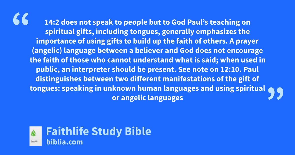 14:2 does not speak to people but to God Paul’s teaching on spiritual gifts, including tongues, generally emphasizes the importance of using gifts to build up the faith of others. A prayer (angelic) language between a believer and God does not encourage the faith of those who cannot understand what is said; when used in public, an interpreter should be present. See note on 12:10.