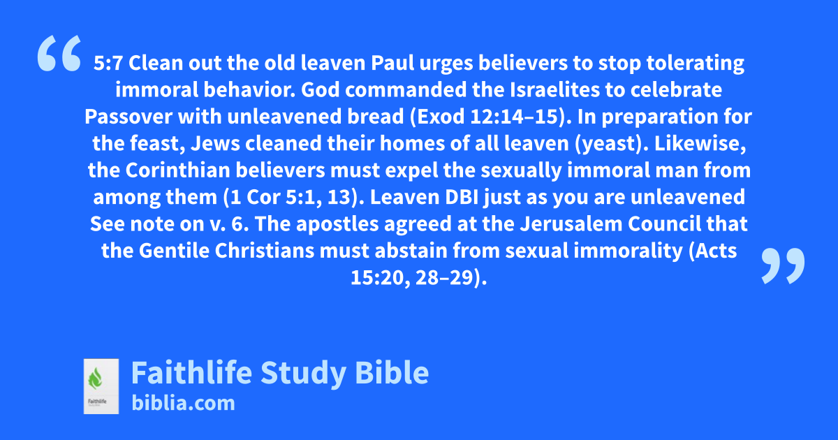 God commanded the Israelites to celebrate Passover with unleavened bread (Exod 12:14–15). In preparation for the feast, Jews cleaned their homes of all leaven (yeast). Likewise, the Corinthian believers must expel the sexually immoral man from among them (1 Cor 5:1, 13).