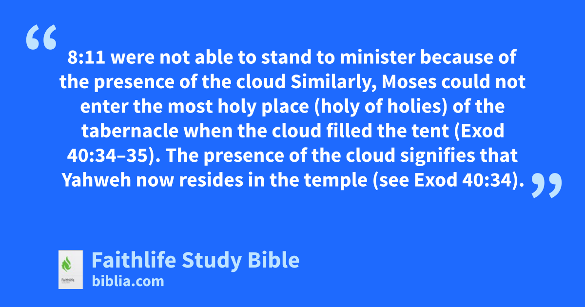 8:11 were not able to stand to minister because of the presence of the cloud Similarly, Moses could not enter the most holy place (holy of holies) of the tabernacle when the cloud filled the tent (Exod 40:34–35). The presence of the cloud signifies that Yahweh now resides in the temple (see Exod 40:34).