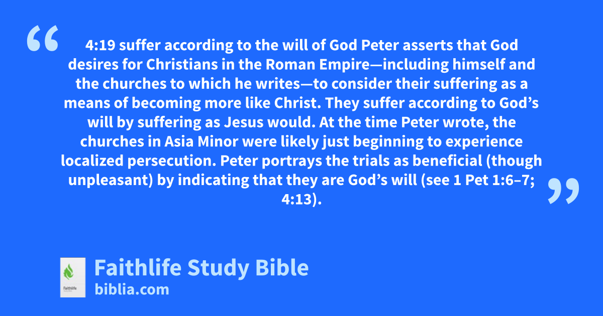 4:19 suffer according to the will of God Peter asserts that God desires for Christians in the Roman Empire—including himself and the churches to which he writes—to consider their suffering as a means of becoming more like Christ. They suffer according to God’s will by suffering as Jesus would.