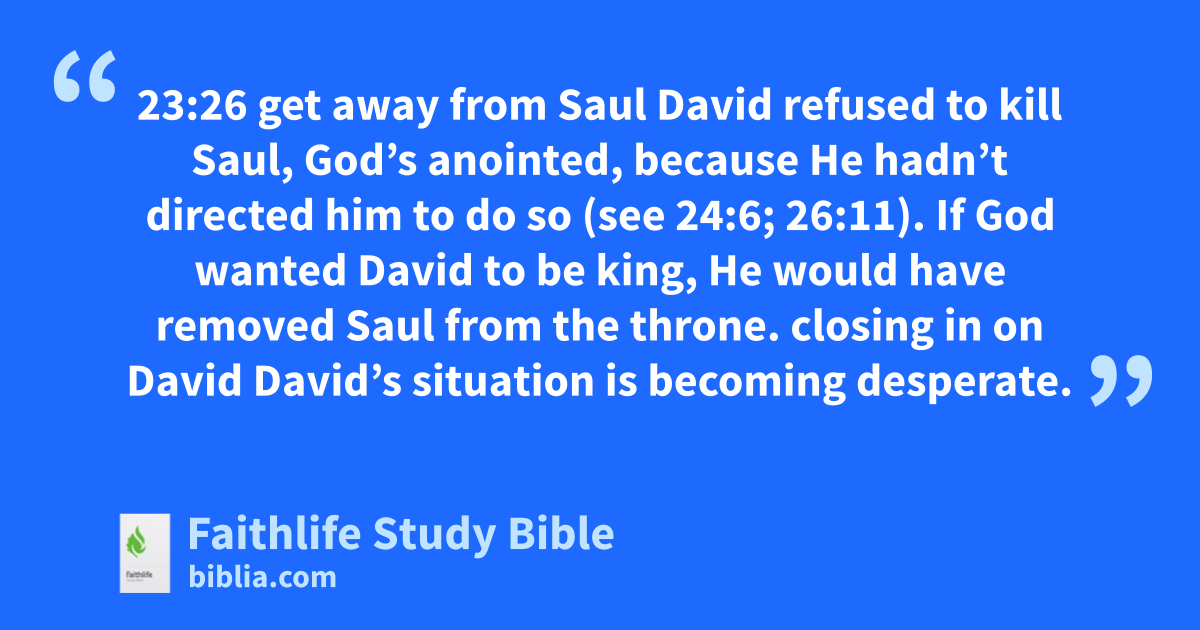 23:26 get away from Saul David refused to kill Saul, God’s anointed, because He hadn’t directed him to do so (see 24:6; 26:11). If God wanted David to be king, He would have removed Saul from the throne.