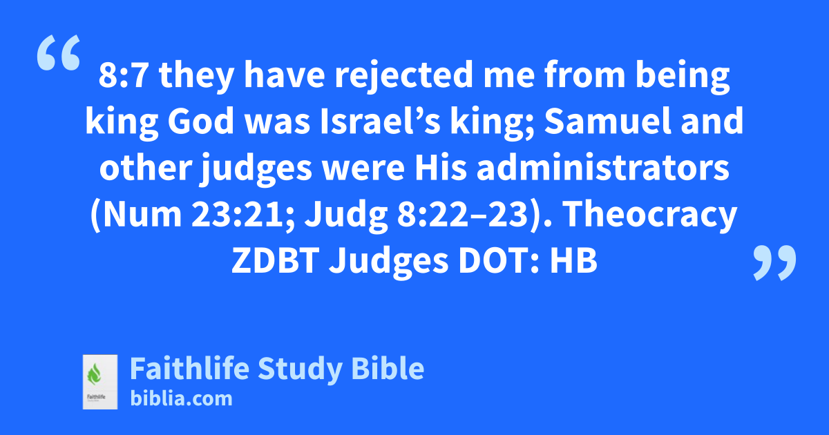 8:7 they have rejected me from being king God was Israel’s king; Samuel and other judges were His administrators (Num 23:21; Judg 8:22–23).