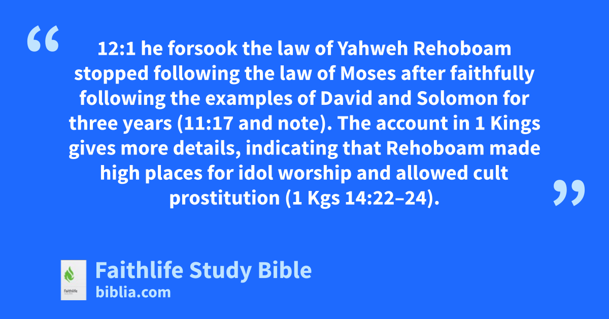 12:1 he forsook the law of Yahweh Rehoboam stopped following the law of Moses after faithfully following the examples of David and Solomon for three years (11:17 and note).