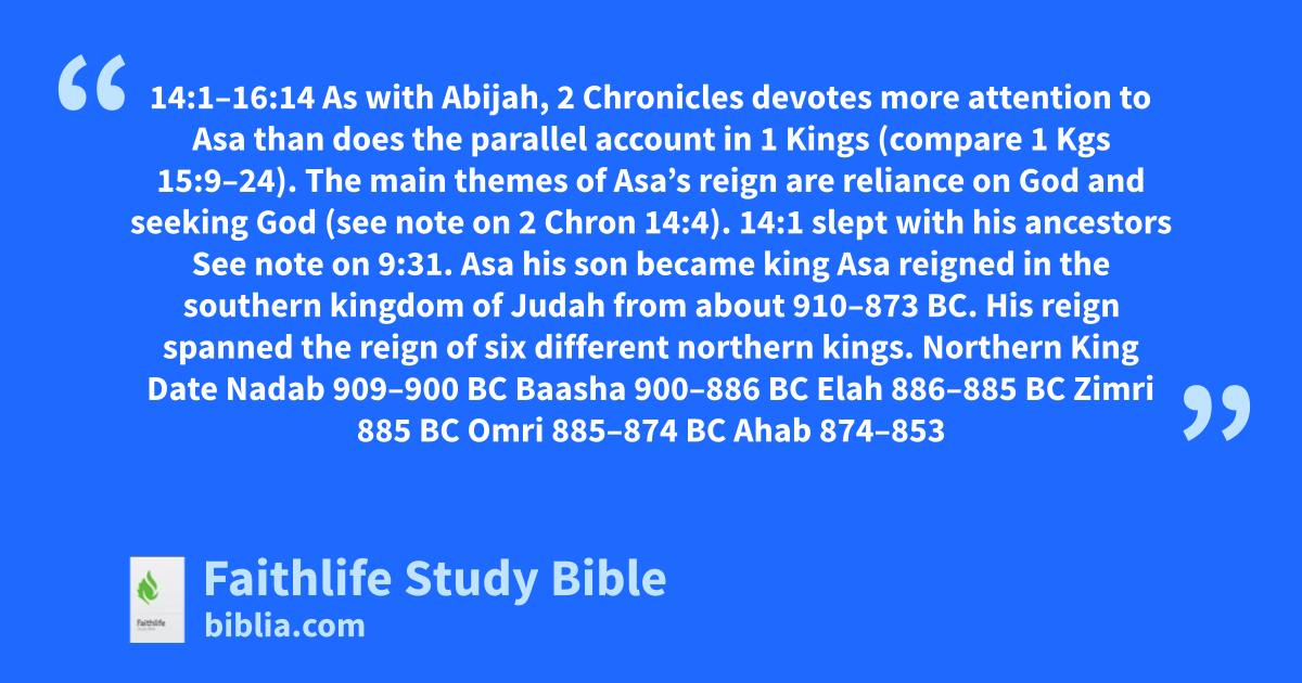 14:1–16:14 As with Abijah, 2 Chronicles devotes more attention to Asa than does the parallel account in 1 Kings (compare 1 Kgs 15:9–24). The main themes of Asa’s reign are reliance on God and seeking God (see note on 2 Chron 14:4). |