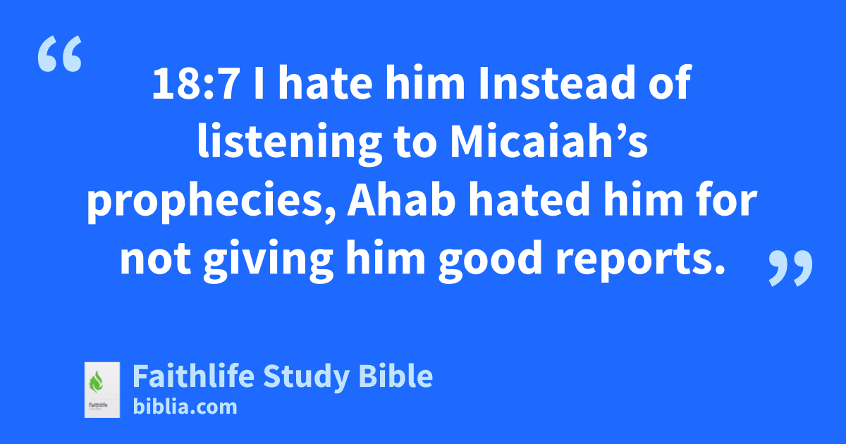 18:7 I hate him Instead of listening to Micaiah’s prophecies, Ahab hated him for not giving him good reports.
