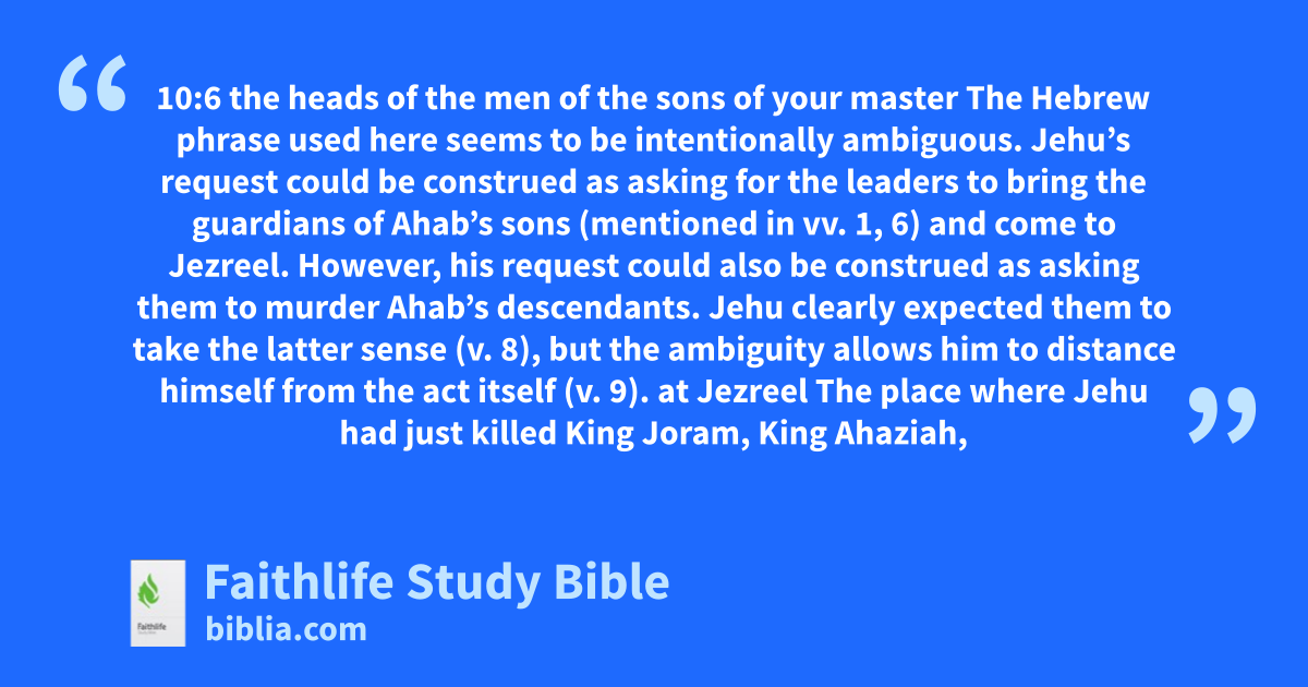 10:6 the heads of the men of the sons of your master The Hebrew phrase used here seems to be intentionally ambiguous. Jehu’s request could be construed as asking for the leaders to bring the guardians of Ahab’s sons (mentioned in vv. 1, 6) and come to Jezreel. However, his request could also be construed as asking them to murder Ahab’s descendants. Jehu clearly expected them to take the latter sense (v. 8), but the ambiguity allows him to distance himself from the act itself (v. 9).