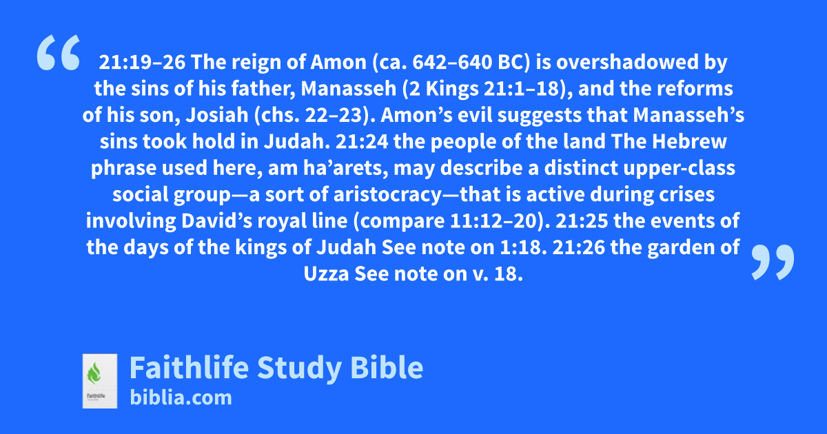 21:19–26 The reign of Amon (ca. 642–640 bc) is overshadowed by the sins of his father, Manasseh (2 Kings 21:1–18), and the reforms of his son, Josiah (chs. 22–23). Amon’s evil suggests that Manasseh’s sins took hold in Judah. |