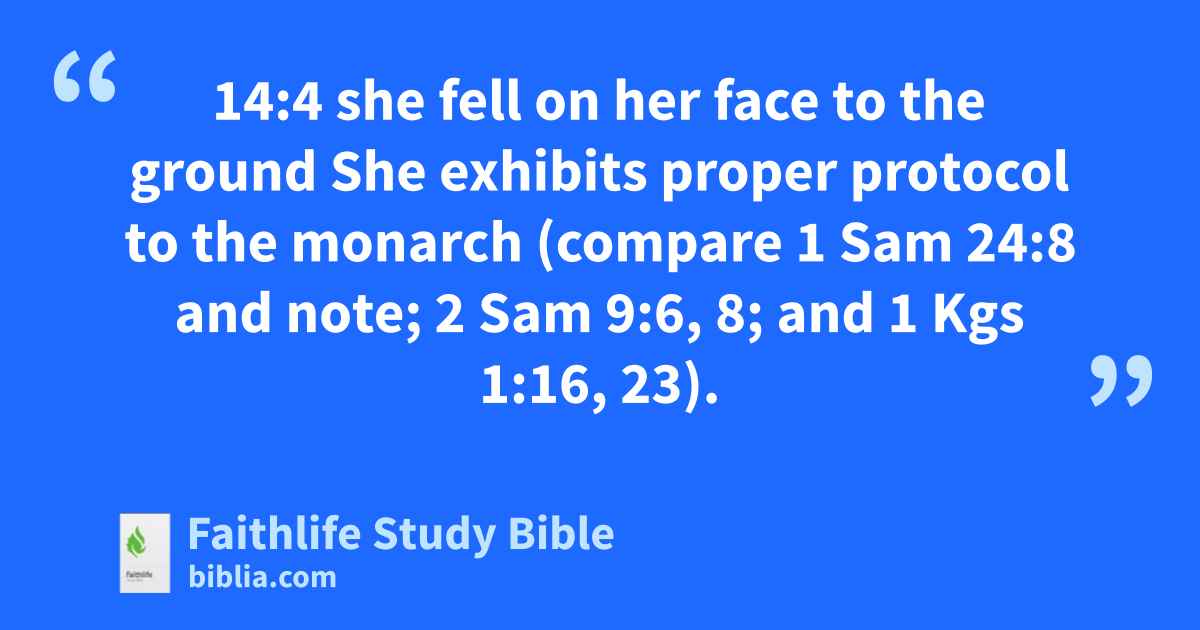 14:4 she fell on her face to the ground She exhibits proper protocol to the monarch (compare 1 Sam 24:8 and note; 2 Sam 9:6, 8; and 1 Kgs 1:16, 23).