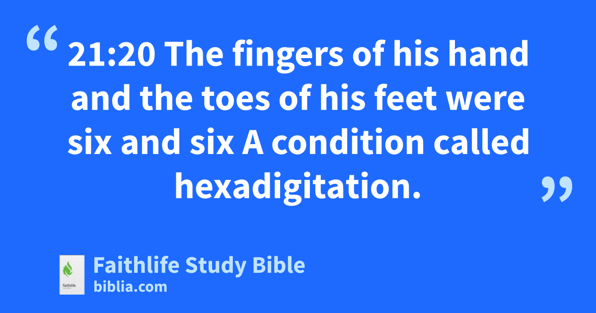 21:20 The fingers of his hand and the toes of his feet were six and six A condition called hexadigitation.