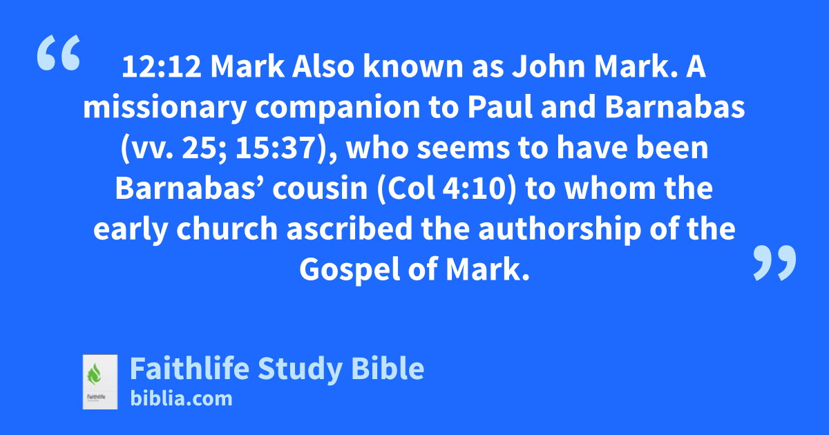 12:12 Mark Also known as John Mark. A missionary companion to Paul and Barnabas (vv. 25; 15:37), who seems to have been Barnabas’ cousin (Col 4:10) to whom the early church ascribed the authorship of the Gospel of Mark.