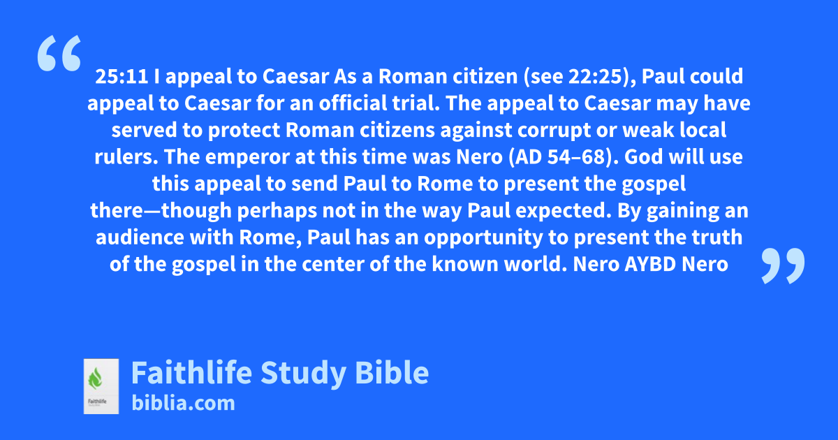 25:11 I appeal to Caesar As a Roman citizen (see 22:25), Paul could appeal to Caesar for an official trial. The appeal to Caesar may have served to protect Roman citizens against corrupt or weak local rulers. The emperor at this time was Nero (ad 54–68).