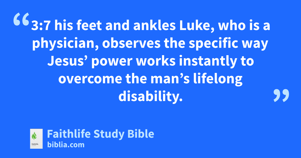 3:7 his feet and ankles Luke, who is a physician, observes the specific way Jesus’ power works instantly to overcome the man’s lifelong disability.
