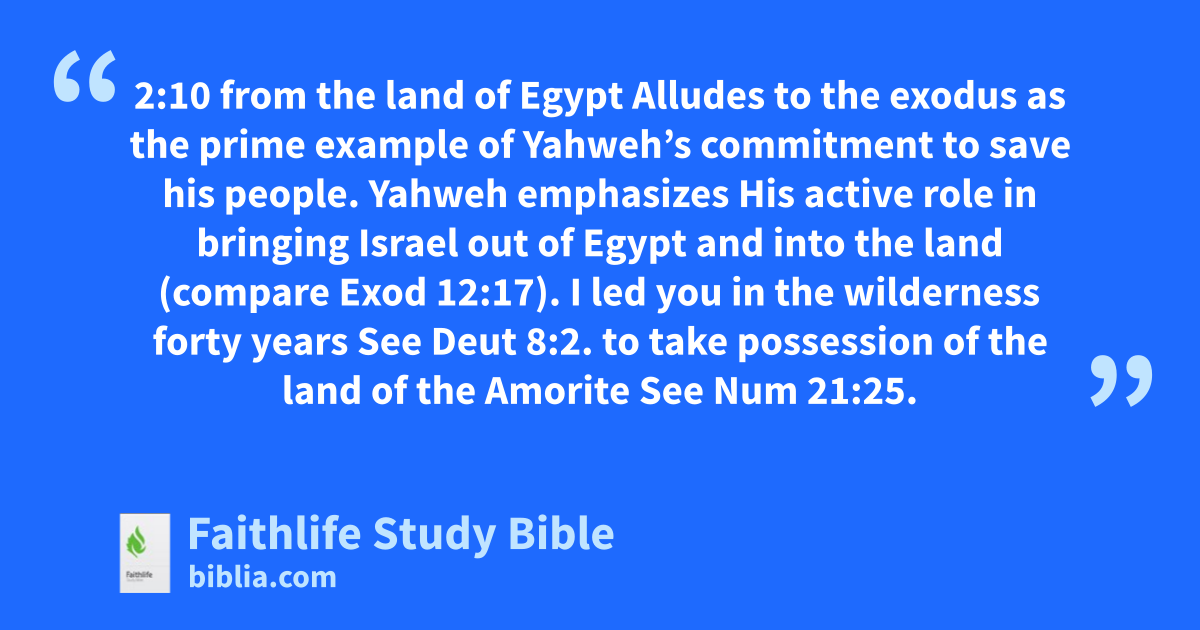 2:10 from the land of Egypt Alludes to the exodus as the prime example of Yahweh’s commitment to save his people. Yahweh emphasizes His active role in bringing Israel out of Egypt and into the land (compare Exod 12:17).