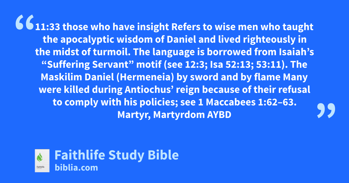 11:33 those who have insight Refers to wise men who taught the apocalyptic wisdom of Daniel and lived righteously in the midst of turmoil. The language is borrowed from Isaiah’s “Suffering Servant” motif (see 12:3; Isa 52:13; 53:11).