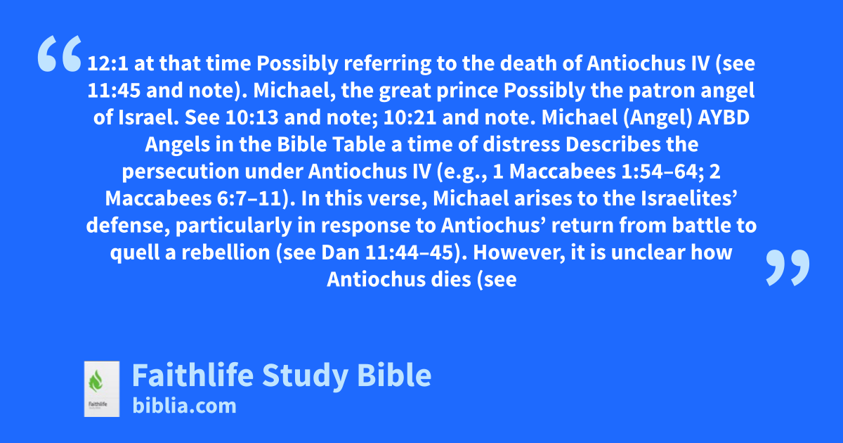 a time of distress Describes the persecution under Antiochus IV (e.g., 1 Maccabees 1:54–64; 2 Maccabees 6:7–11). In this verse, Michael arises to the Israelites’ defense, particularly in response to Antiochus’ return from battle to quell a rebellion (see Dan 11:44–45). However, it is unclear how Antiochus dies (see 11:45 and note).