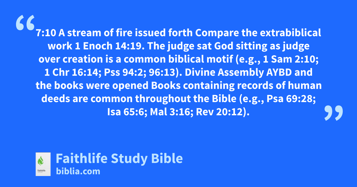 7:10 A stream of fire issued forth Compare the extrabiblical work 1 Enoch 14:19.