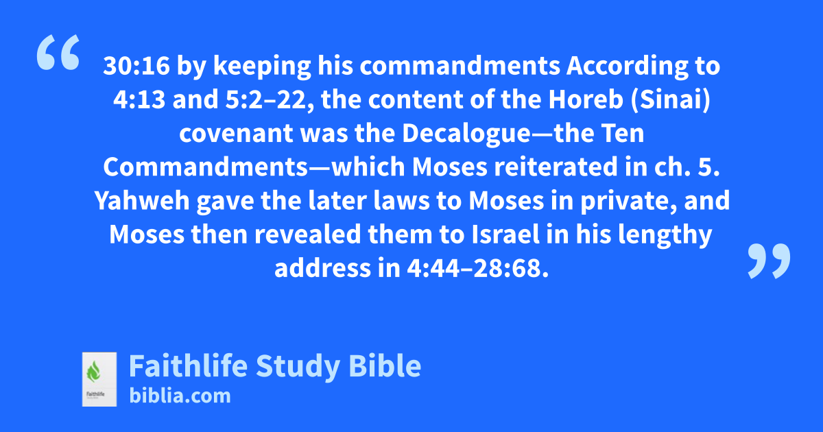 30:16 by keeping his commandments According to 4:13 and 5:2–22, the content of the Horeb (Sinai) covenant was the Decalogue—the Ten Commandments—which Moses reiterated in ch. 5. Yahweh gave the later laws to Moses in private, and Moses then revealed them to Israel in his lengthy address in 4:44–28:68.