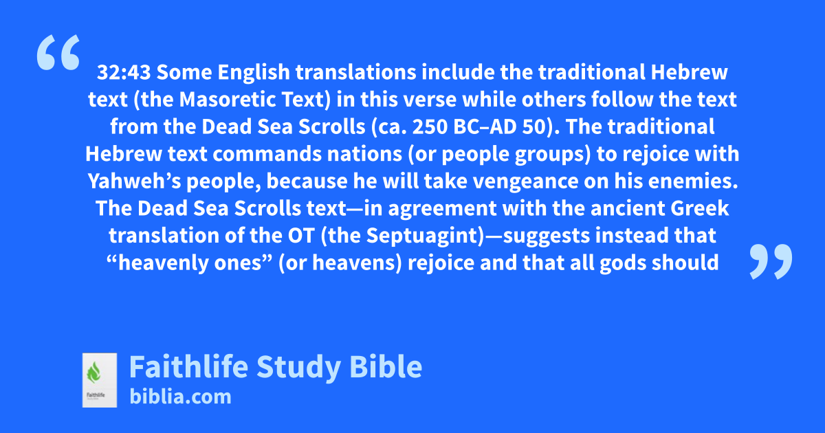 32:43 Some English translations include the traditional Hebrew text (the Masoretic Text) in this verse while others follow the text from the Dead Sea Scrolls (ca. 250 bc–ad 50). The traditional Hebrew text commands nations (or people groups) to rejoice with Yahweh’s people, because he will take vengeance on his enemies. The Dead Sea Scrolls text—in agreement with the ancient Greek translation of the ot (the Septuagint)—suggests instead that “heavenly ones” (or heavens) rejoice and that all gods should bow down before Yahweh. This seems to refer to the heavenly host (divine council) |