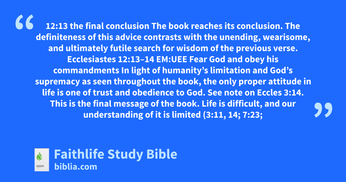 12:13 the final conclusion The book reaches its conclusion. The definiteness of this advice contrasts with the unending, wearisome, and ultimately futile search for wisdom of the previous verse.