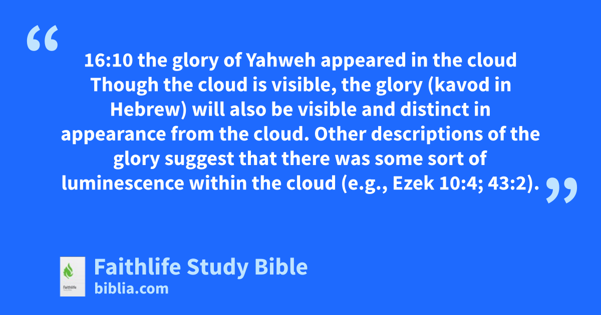 16:10 the glory of Yahweh appeared in the cloud Though the cloud is visible, the glory (kavod in Hebrew) will also be visible and distinct in appearance from the cloud. Other descriptions of the glory suggest that there was some sort of luminescence within the cloud (e.g., Ezek 10:4; 43:2).