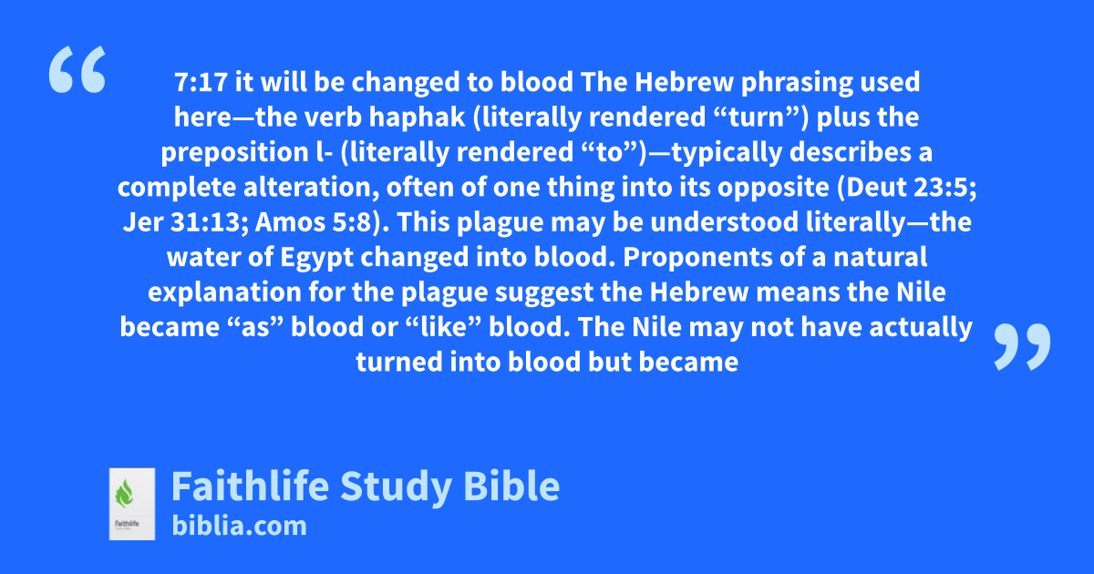 7:17 it will be changed to blood The Hebrew phrasing used here—the verb haphak (literally rendered “turn”) plus the preposition l- (literally rendered “to”)—typically describes a complete alteration, often of one thing into its opposite (Deut 23:5; Jer 31:13; Amos 5:8). This plague may be understood literally—the water of Egypt changed into blood.
