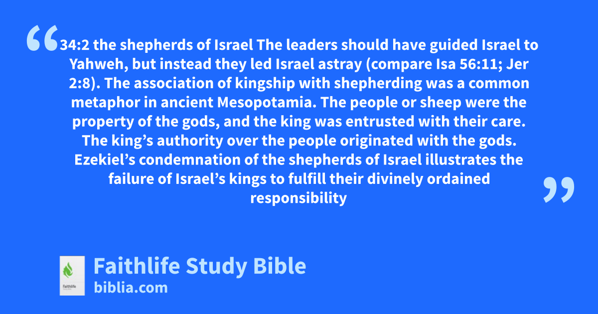 34:2 the shepherds of Israel The leaders should have guided Israel to Yahweh, but instead they led Israel astray (compare Isa 56:11; Jer 2:8).