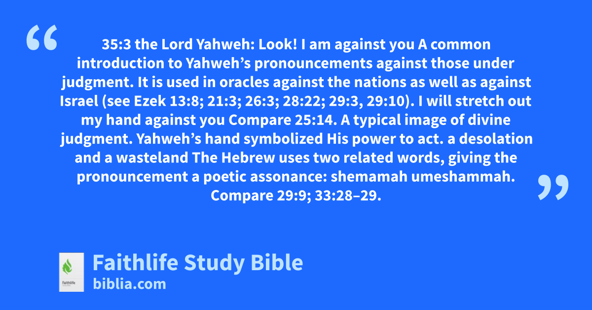 35:3 the Lord Yahweh: Look! I am against you A common introduction to Yahweh’s pronouncements against those under judgment. It is used in oracles against the nations as well as against Israel (see Ezek 13:8; 21:3; 26:3; 28:22; 29:3, 29:10).