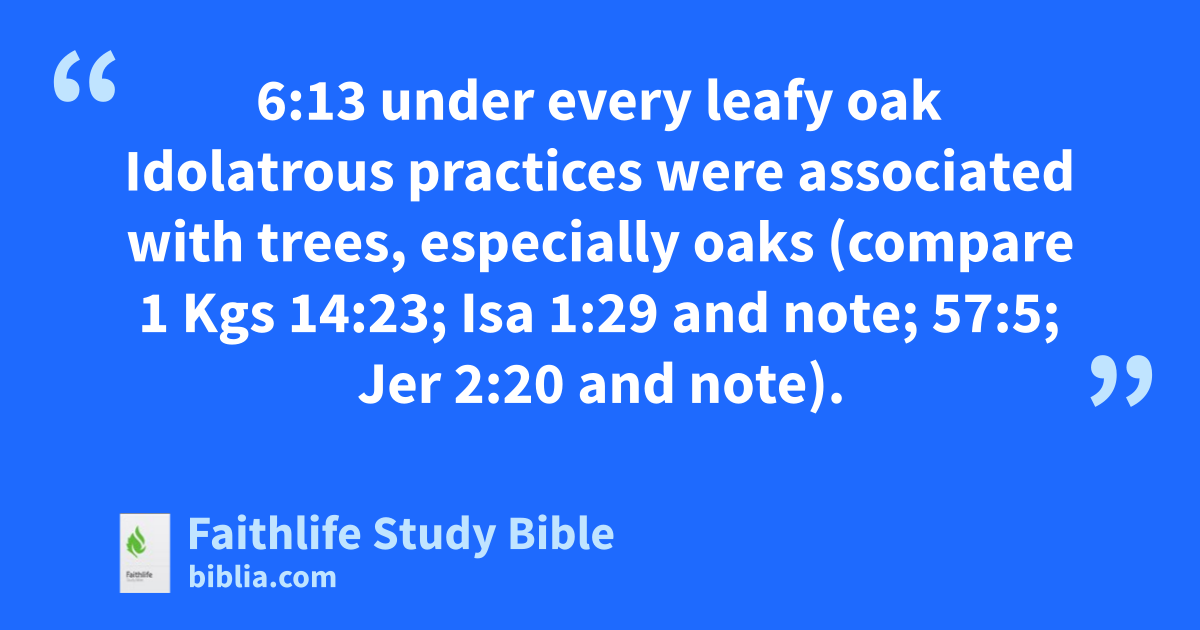 6:13 under every leafy oak Idolatrous practices were associated with trees, especially oaks (compare 1 Kgs 14:23; Isa 1:29 and note; 57:5; Jer 2:20 and note).