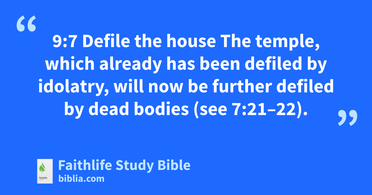 9:7 Defile the house The temple, which already has been defiled by idolatry, will now be further defiled by dead bodies (see 7:21–22).