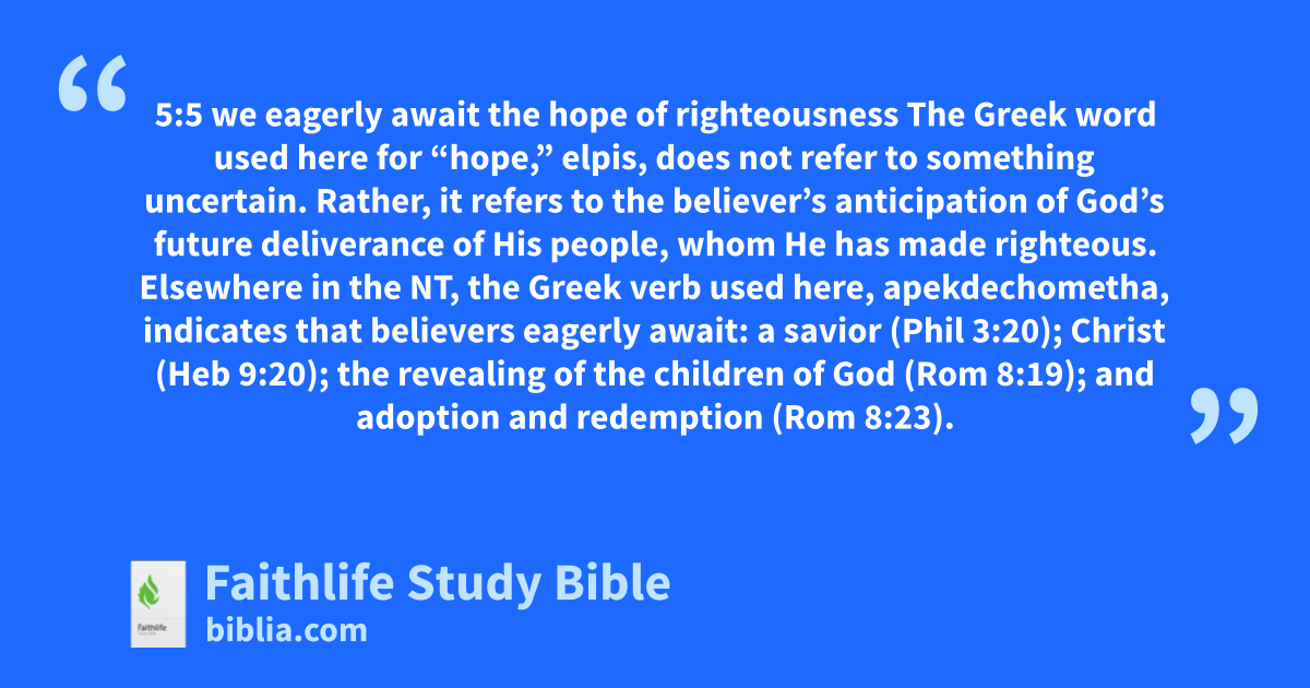 5:5 we eagerly await the hope of righteousness The Greek word used here for “hope,” elpis, does not refer to something uncertain. Rather, it refers to the believer’s anticipation of God’s future deliverance of His people, whom He has made righteous.