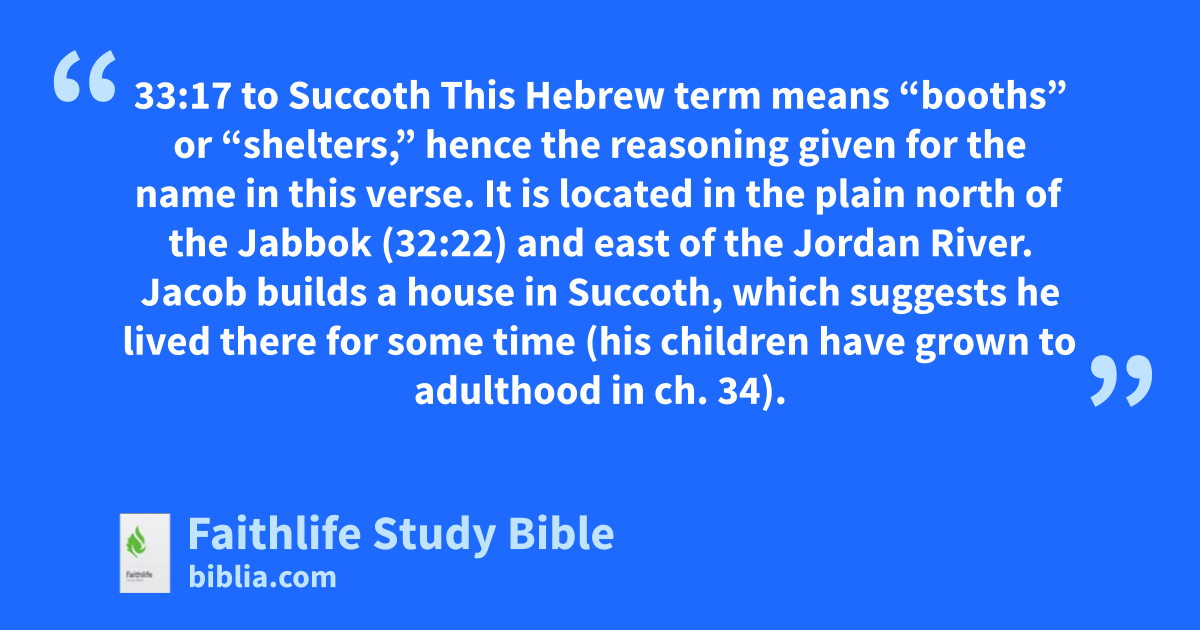 33:17 to Succoth This Hebrew term means “booths” or “shelters,” hence the reasoning given for the name in this verse. It is located in the plain north of the Jabbok (32:22) and east of the Jordan River.
