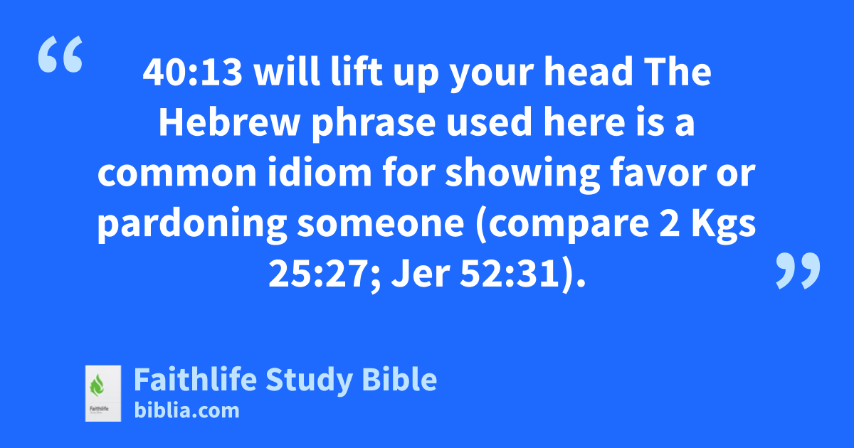 40:13 will lift up your head The Hebrew phrase used here is a common idiom for showing favor or pardoning someone (compare 2 Kgs 25:27; Jer 52:31).