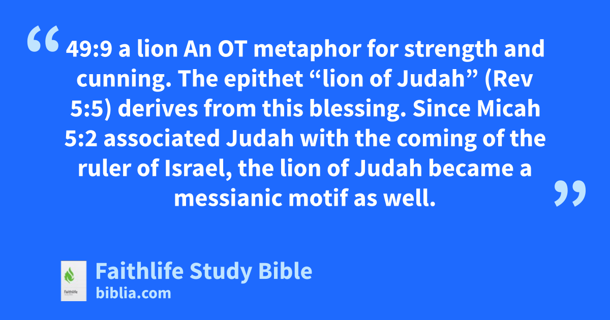 49:9 a lion An ot metaphor for strength and cunning. The epithet “lion of Judah” (Rev 5:5) derives from this blessing. Since Micah 5:2 associated Judah with the coming of the ruler of Israel, the lion of Judah became a messianic motif as well.