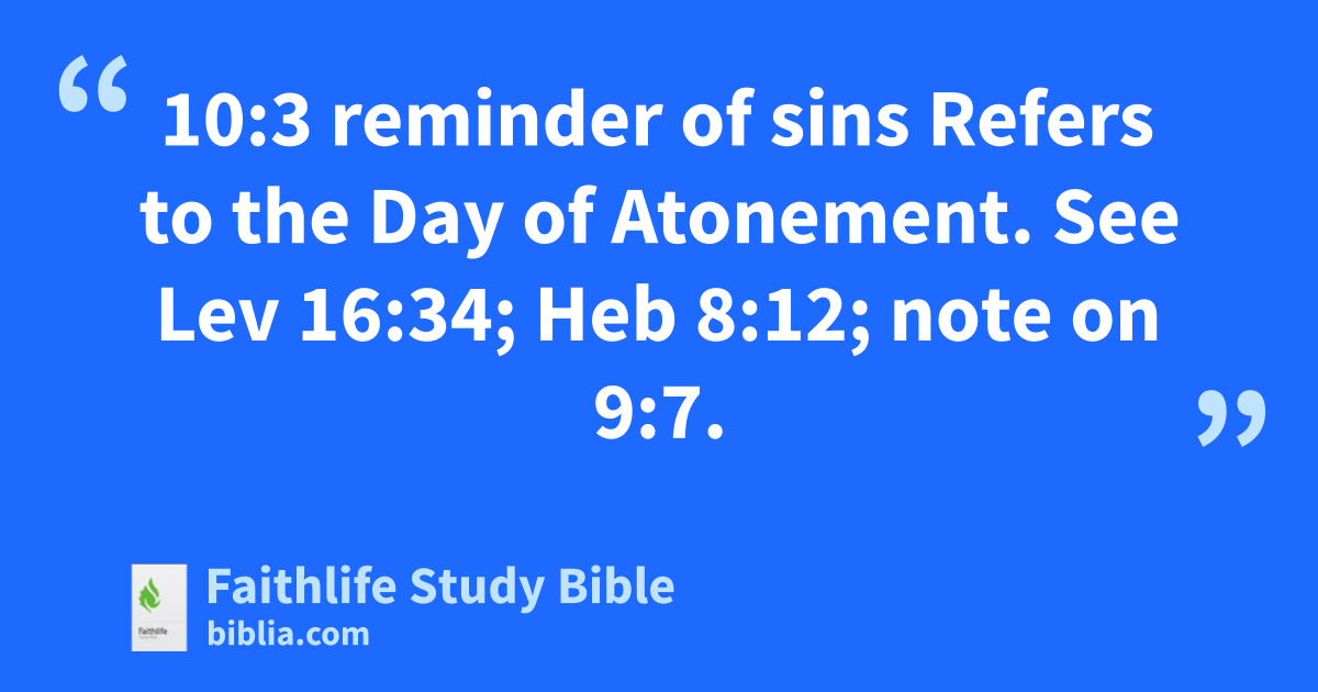 10:3 reminder of sins Refers to the Day of Atonement. See Lev 16:34; Heb 8:12; note on 9:7.