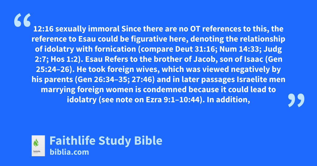 12:16 sexually immoral Since there are no ot references to this, the reference to Esau could be figurative here, denoting the relationship of idolatry with fornication (compare Deut 31:16; Num 14:33; Judg 2:7; Hos 1:2).