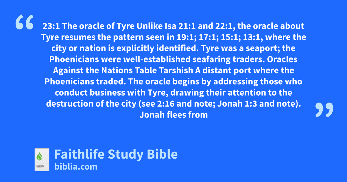 23:1 The oracle of Tyre Unlike Isa 21:1 and 22:1, the oracle about Tyre resumes the pattern seen in 19:1; 17:1; 15:1; 13:1, where the city or nation is explicitly identified. Tyre was a seaport; the Phoenicians were well-established seafaring traders.