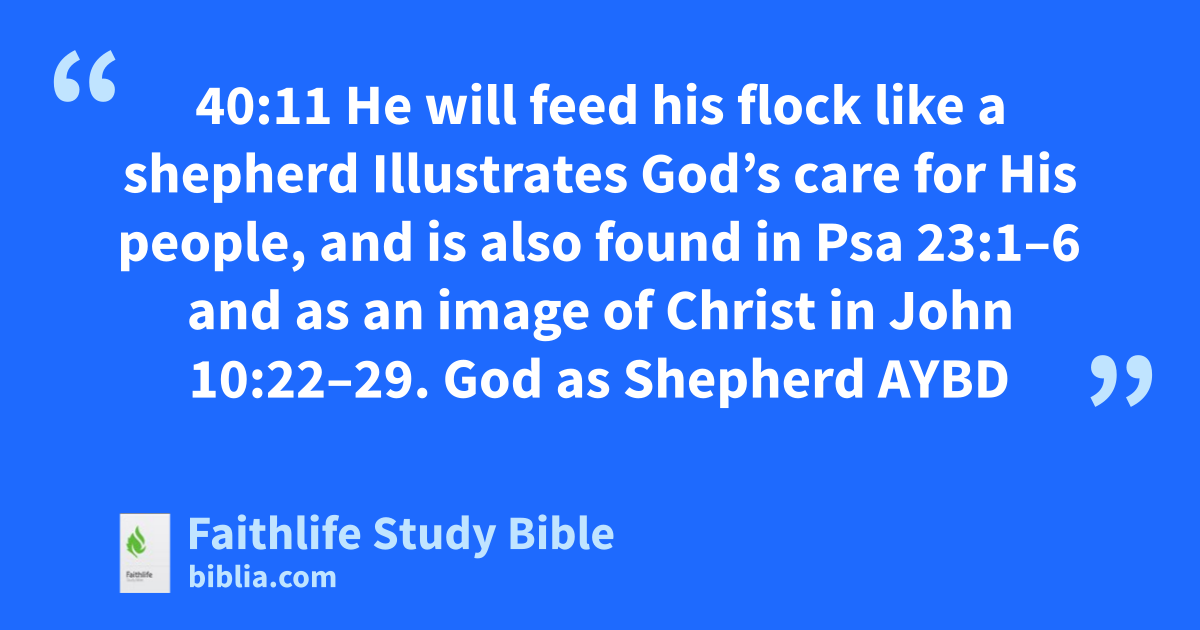 40:11 He will feed his flock like a shepherd Illustrates God’s care for His people, and is also found in Psa 23:1–6 and as an image of Christ in John 10:22–29.