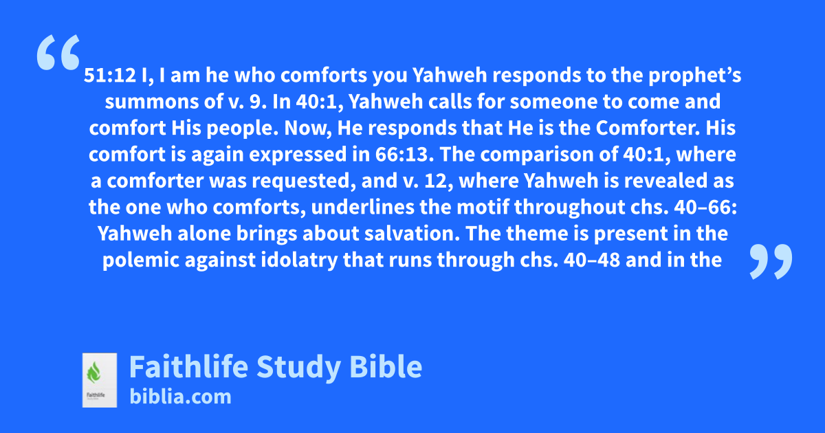 51:12 I, I am he who comforts you Yahweh responds to the prophet’s summons of v. 9. In 40:1, Yahweh calls for someone to come and comfort His people. Now, He responds that He is the Comforter. His comfort is again expressed in 66:13.