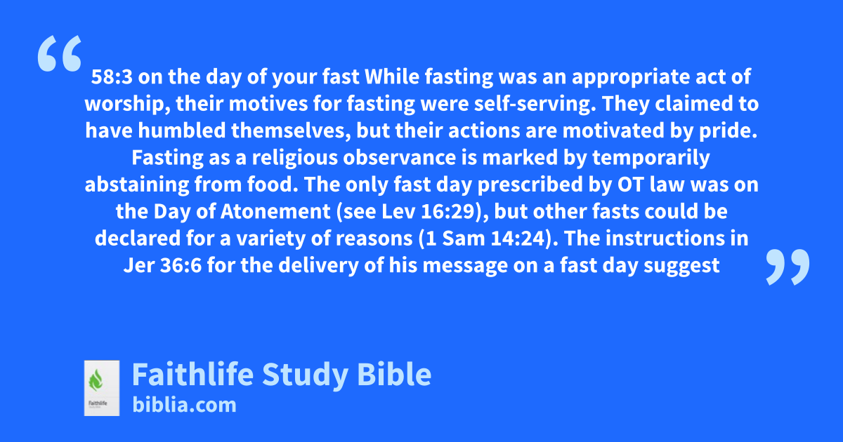 58:3 on the day of your fast While fasting was an appropriate act of worship, their motives for fasting were self-serving. They claimed to have humbled themselves, but their actions are motivated by pride.