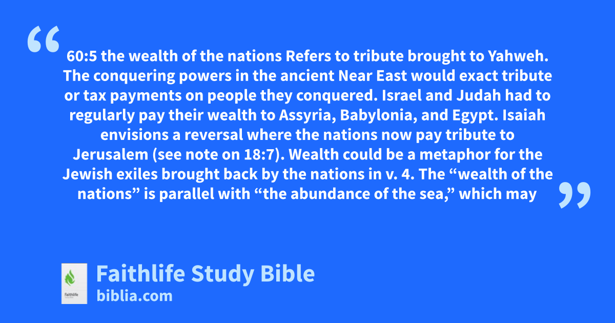 60:5 the wealth of the nations Refers to tribute brought to Yahweh. The conquering powers in the ancient Near East would exact tribute or tax payments on people they conquered. Israel and Judah had to regularly pay their wealth to Assyria, Babylonia, and Egypt. Isaiah envisions a reversal where the nations now pay tribute to Jerusalem (see note on 18:7).