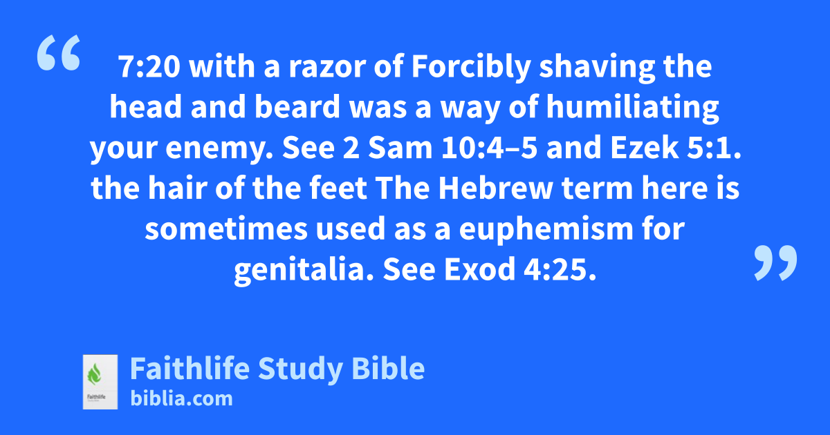 7:20 with a razor of Forcibly shaving the head and beard was a way of humiliating your enemy. See 2 Sam 10:4–5 and Ezek 5:1.