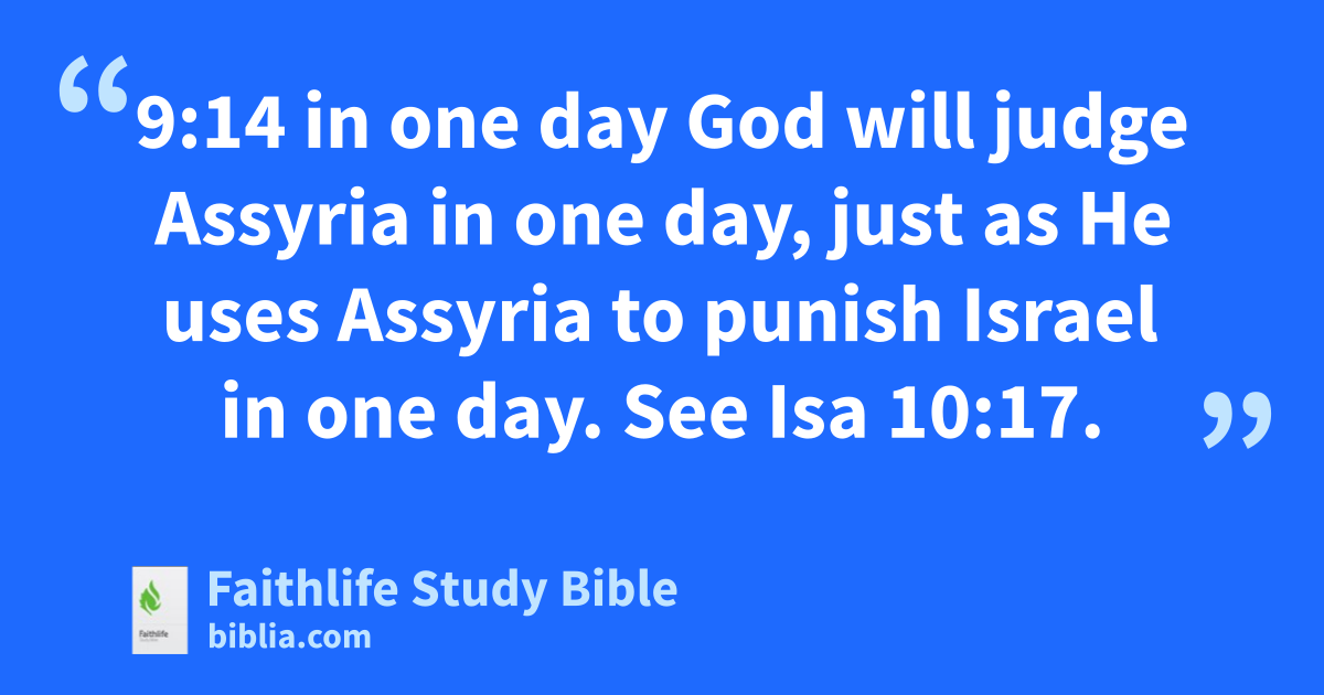 9:14 in one day God will judge Assyria in one day, just as He uses Assyria to punish Israel in one day. See Isa 10:17.