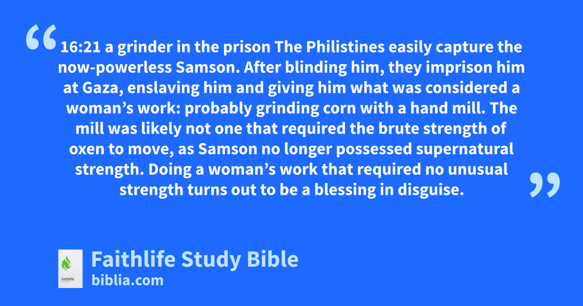 16:21 a grinder in the prison The Philistines easily capture the now-powerless Samson. After blinding him, they imprison him at Gaza, enslaving him and giving him what was considered a woman’s work: probably grinding corn with a hand mill.