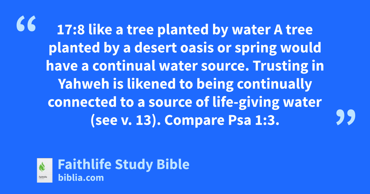17:8 like a tree planted by water A tree planted by a desert oasis or spring would have a continual water source. Trusting in Yahweh is likened to being continually connected to a source of life-giving water (see v. 13). Compare Psa 1:3.